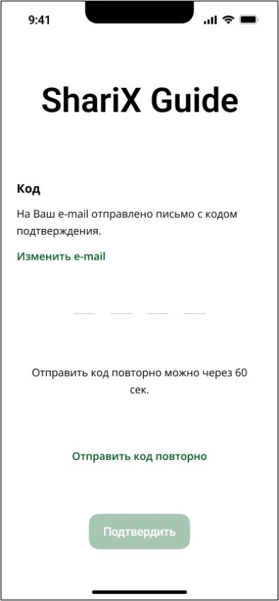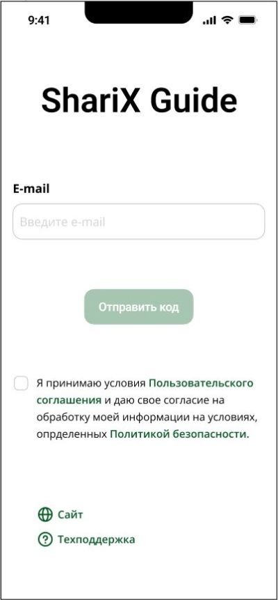 Первым шагом при использовании приложения ShariX Guide для клиента является форма входа в систему, которая включает в себя функции регистрации и авторизации.