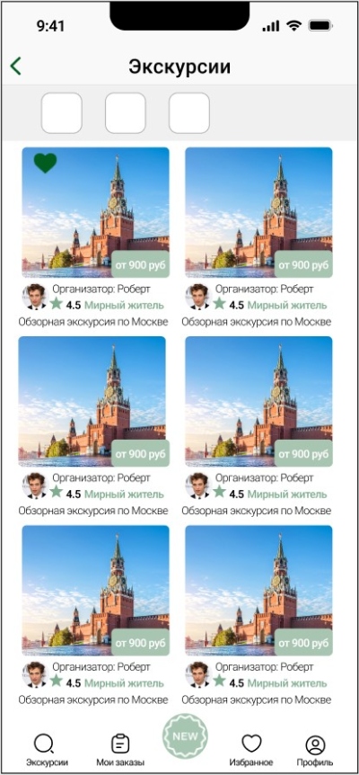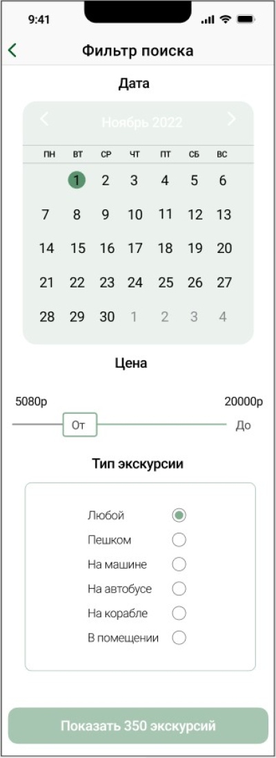 - Фильтры поиска — клиент может использовать фильтры поиска, чтобы уточнить параметры экскурсии, которые он ищет. Фильтры позволяют выбрать экскурсии по дате, типу экскурсии или указать диапазон цены экскурсии. Например, клиент может указать интересующую его дату, выбрать определенный тип экскурсии или самостоятельно задать диапазон цены от 500 до 20 000 рублей, чтобы найти экскурсии, соответствующие его предпочтениям.