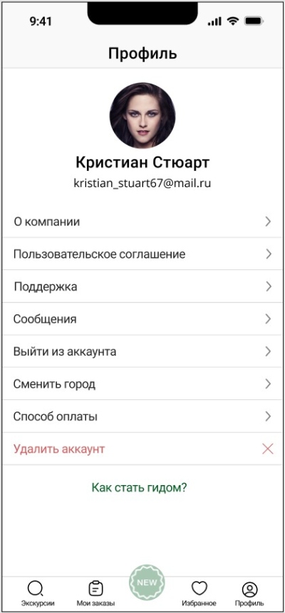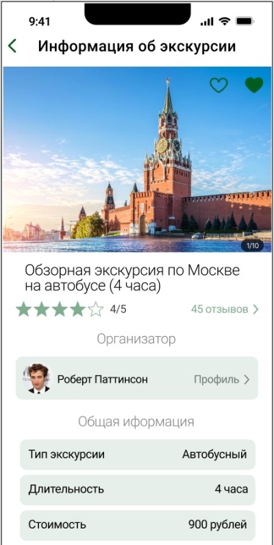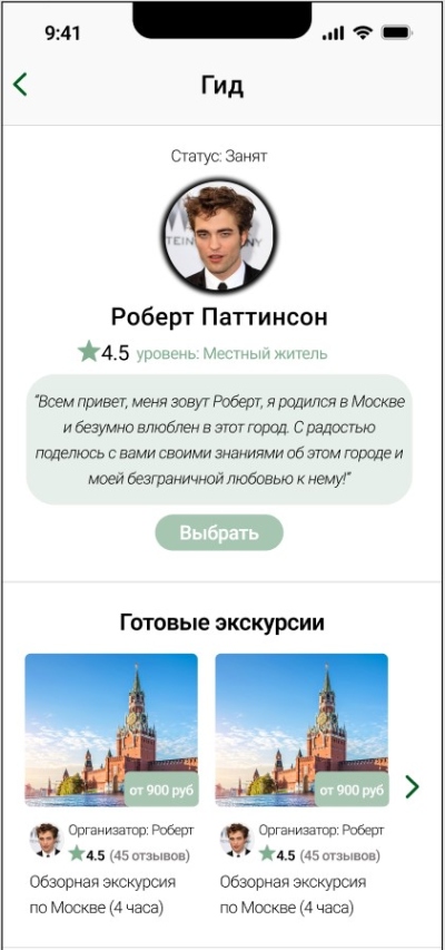 - Просмотр профиля гида — в окне поиска клиент имеет возможность просмотреть профиль гида, чтобы получить дополнительную информацию о его услугах. В профиле гида можно узнать, какие экскурсии проводит данный гид, ознакомиться с его квалификацией, просмотреть отзывы клиентов и оценки работы. Это помогает клиентам подобрать наиболее подходящего гида и выбрать интересующую экскурсию.