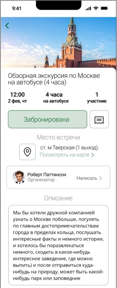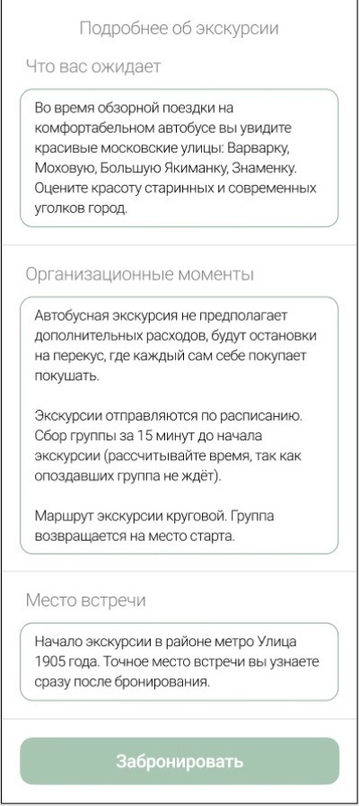 - Описание экскурсии — в этом окне предоставляется подробное описание самой экскурсии. Это может включать информацию о достопримечательностях, которые будут посещены, интересных фактах и историческом контексте. Клиенты получают представление о том, чего ожидать от экскурсии и чем она будет интересна.