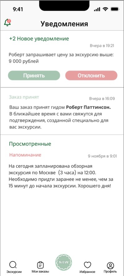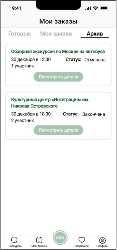 - Архив — в этом разделе клиент найдет все предыдущие заказы экскурсий, которые были завершены или отменены. Здесь можно просмотреть историю предыдущих приключений, включая информацию о датах, гидах, местах встречи и других подробностях.