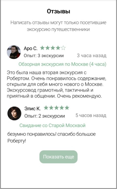 Также в окне описания услуг предусмотрена возможность оставить отзыв об экскурсии или прочитать имеющиеся отзывы от других клиентов. Это позволяет клиентам делиться своими впечатлениями и помогает другим клиентам принять решение о выборе экскурсии.