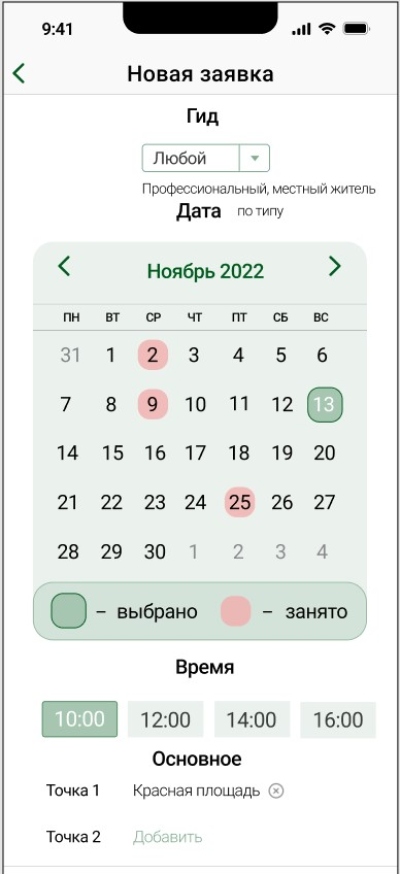 В этом разделе клиент выбирает гида, указывает желаемую дату, время и город проведения экскурсии, а также задает продолжительность и способ передвижения во время путешествия.