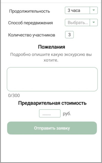 В приложении клиент имеет возможность отправить заявку на индивидуальную экскурсию, которая будет специально организована для него.