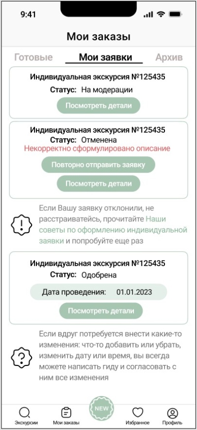 - Мои заявки — в этом разделе клиент найдет все свои индивидуальные заявки на экскурсии, которые были специально организованы для него по запросу. Здесь можно просмотреть подробности заявок, включая выбранного гида, дату, время и дополнительные детали.